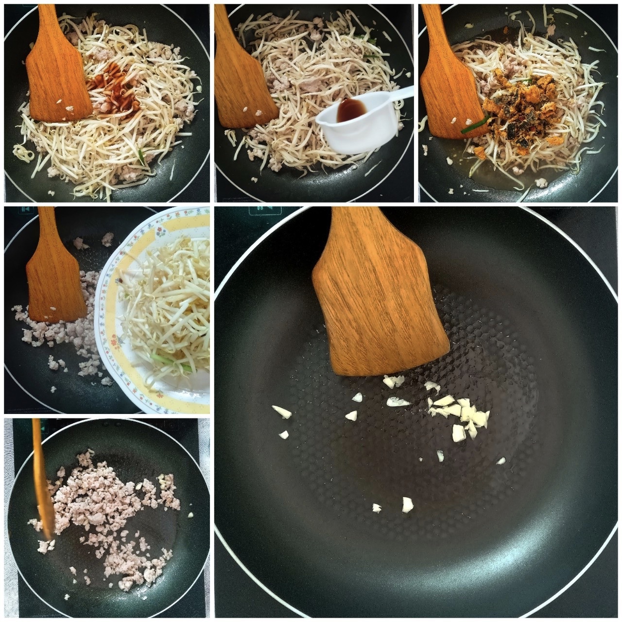 ၄။ ပြီးနောက် ပဲပင်ပေါက်၊ ခရုဆီ နှင့် ပဲငံပြာရည် တို့ကိုထည့်ပါ။ ထို့နောက် ပဲပင်ပေါက်များ အနည်းငယ်ပျော့သွားသည် အထိခပ်မြန်မြန်လေး မွှေပေးပါ။